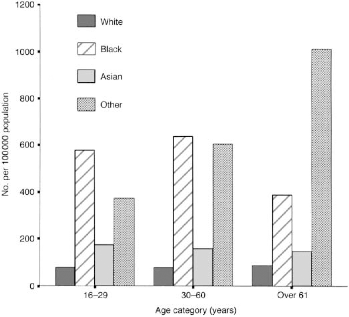 When rates of sectioning are standardised as number per unit of ethnically specific population, there are striking differences between the ethnic groups. Detentions are over six times more likely to be of Black people than of White people (450 v. 68 per 100 000 population); the rate of detentions involving Asian people is 65% higher than those involving White people (112 per 100 000). The rate of detentions of people from other ethnic minority groups is intermediate between that for Asian people and Black people (324 per 100 000). Detentions of Black men are eight times more frequent than detentions of White men (553 v. 69 per 100 000). As Fig. 3 shows, the pattern of differences in rates of sectioning between ethnic groups is present at all ages. The census data permit age and ethnicity to be analysed only in broad age bands. Also, only a relatively small number of detentions (529) were of people from the ethnic groups assigned to the ‘Other’ category, with 54 detentions in those aged over 61 years.