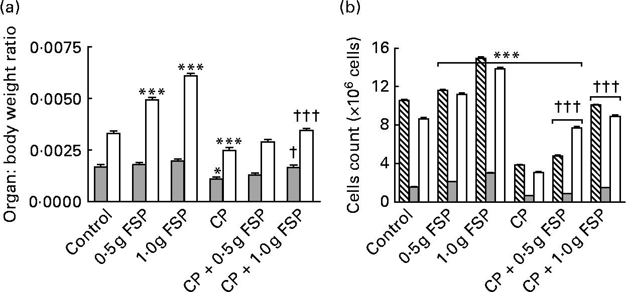Fig. 2 Modulatory effects of fenugreek seed powder (FSP) on the changes in weights (a) and cellularity (b) of lymphoid organs in the healthy and immunosuppressed rat models. Values are means, with standard errors represented by vertical bars. Mean values were significantly different from that of the control group: *P < 0·05, ***P < 0·001. Mean values were significantly different from that of the cyclophosphamide (CP)-only-treated group: †P < 0·05, †††P < 0·001. (a)  , Thymus; □, spleen. (b) ▧, Bone marrow;