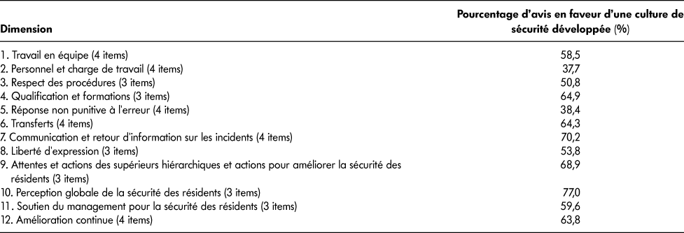 Tableau 2 : Scores de culture de sécurité dans chacune des 12 dimensions de la version française du NHSPSC calculés dans un échantillon de cinq EHPAD d’Ile-de-France
