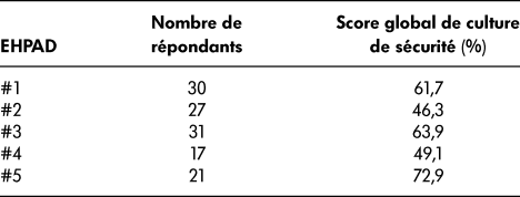 Tableau 3 : Score global de culture de sécurité dans chacun des cinq EHPAD d’Ile-de-France enquêté