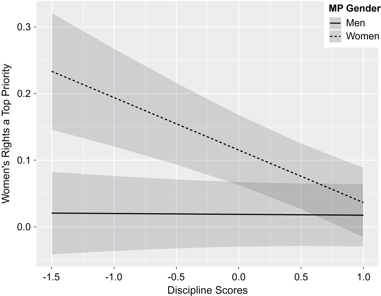 0.001; see Model 2 of Table A16, SI § 12). Women MPs with higher levels of party discipline are much less likely to list women’s rights as a top government priority than less disciplined women, whereas men, for their part, are unmoved. Figure 2 illustrates this finding by plotting predicted values for both men and women MPs across the range of discipline scores. Consistent with our expectations, we see that disciplined women behave more like men MPs on this issue and that it is undisciplined women in particular who most strongly prioritize women’s rights in their legislative work.