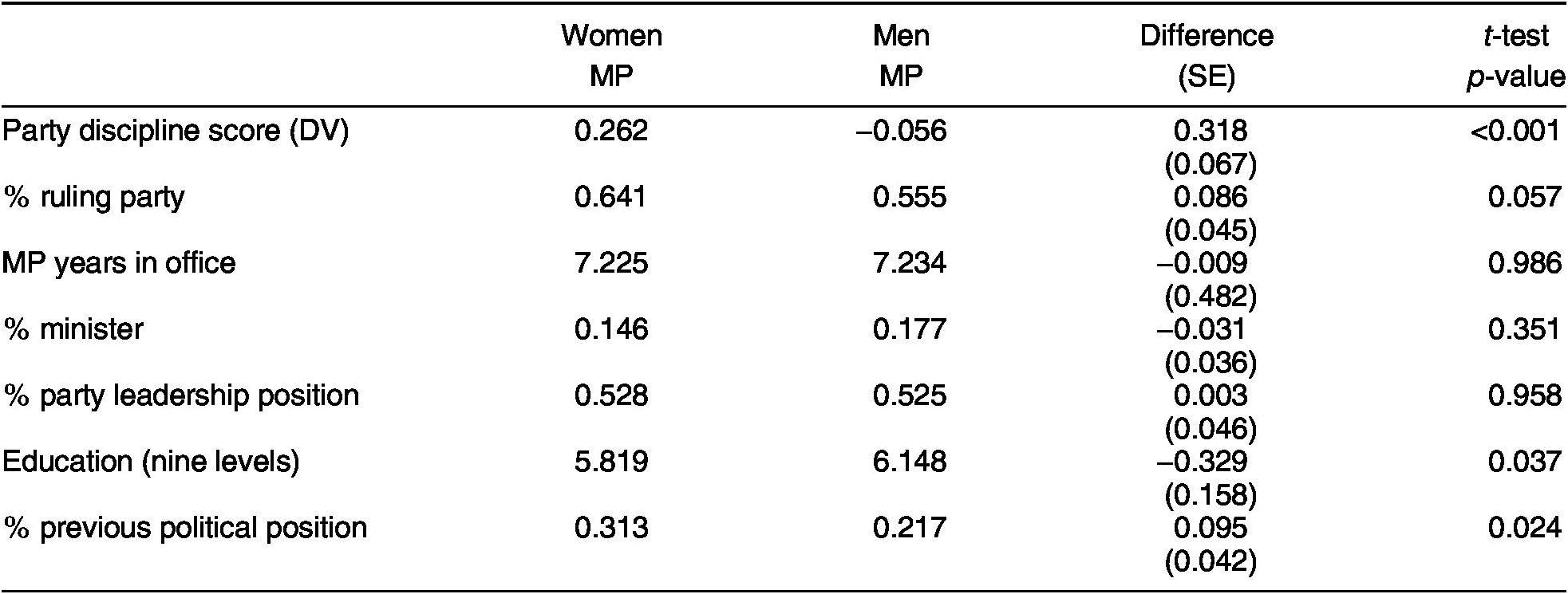 Table 2 presents descriptive statistics for women and men MPs, including the composite discipline score as well as other postelection characteristics that serve as controls in the multivariate analyses that follow: MP years in office, appointment to a ministerial post, a position in the party leadership, and ruling party membership. We also include two pre-election characteristics: highest level of education (on a nine-level scale from no formal schooling to a postgraduate degree) and whether the MP held a lower political position (e.g., a district or local councilor position) prior to being elected. We calculate the gender gaps for each characteristic and note their statistical significance with standard two-tailed t-tests.