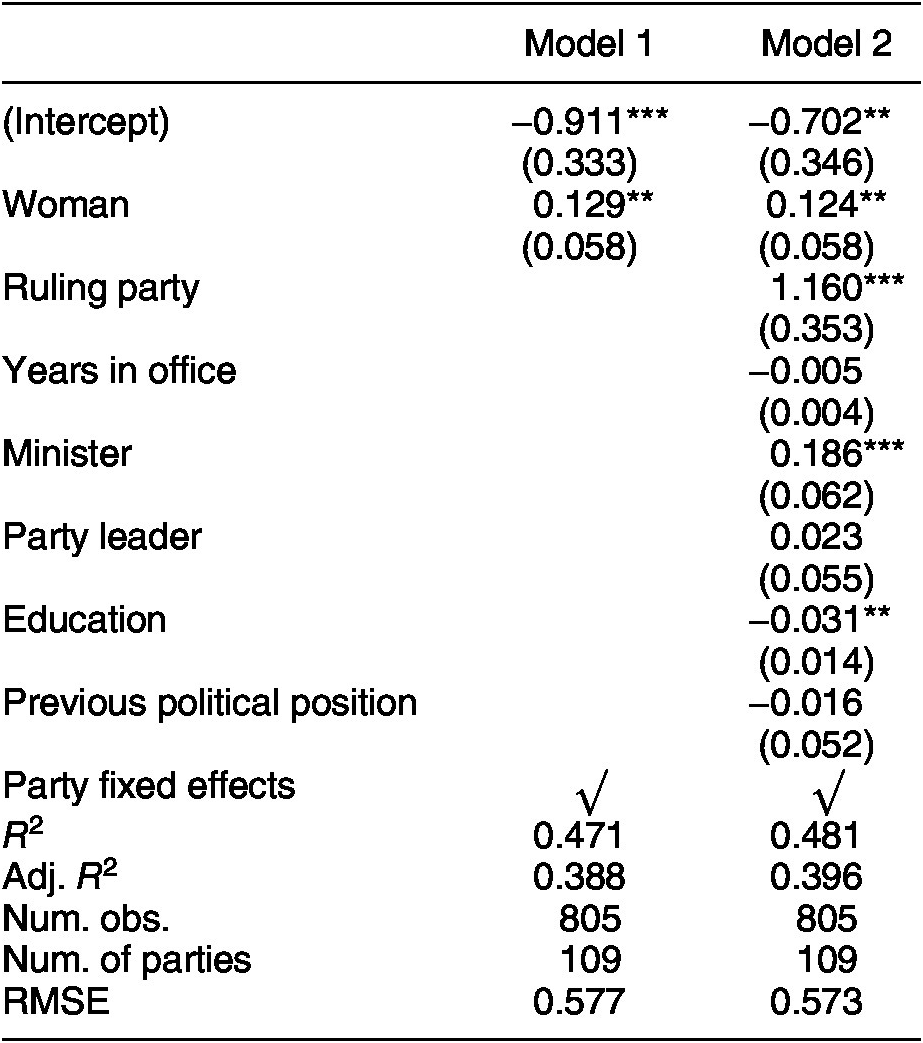 We expect that gender differences in party discipline will hold when controlling for other MP characteristics. To test this expectation, we first run a basic OLS model with party fixed effects. The inclusion of these fixed effects allows us to compare gender differences among MPs in the same country and in the same party.Footnote