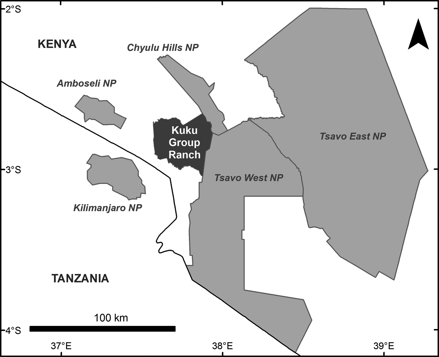 On Kuku Group Ranch (Fig. 1) c. 17,000 people live on 1,133 km2. Annual rainfall is erratic (250–600 mm). Both livestock and wildlife populations increased during 2010–2012; wildlife represent c. 25% of ungulate biomass (Table 1; Maasai Wilderness Conservation Trust, unpubl. data). There are an estimated 20–30 lions on the ranch and they are part of the Amboseli–Tsavo population, which is estimated to comprise 880 individuals (Riggio et al., Reference Riggio, Jacobson, Dollar, Bauer, Becker and Dickman2013). The dominant livelihood is semi-nomadic pastoralism and the majority of household income is derived from livestock sales (Groom, Reference Groom2007). Pastoralists are organized in so-called bomas, settlements around collectively managed corrals where livestock is kept at night, of which there are 1,240 on the ranch.