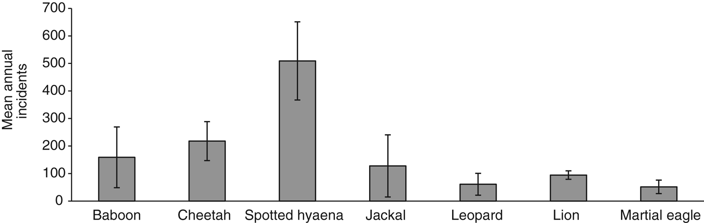 Fig. 2 Mean annual numbers of incidents of livestock depredation by wildlife predators on Kuku Group Ranch during 2008–2013, with standard deviation.