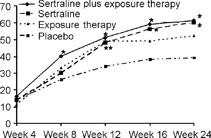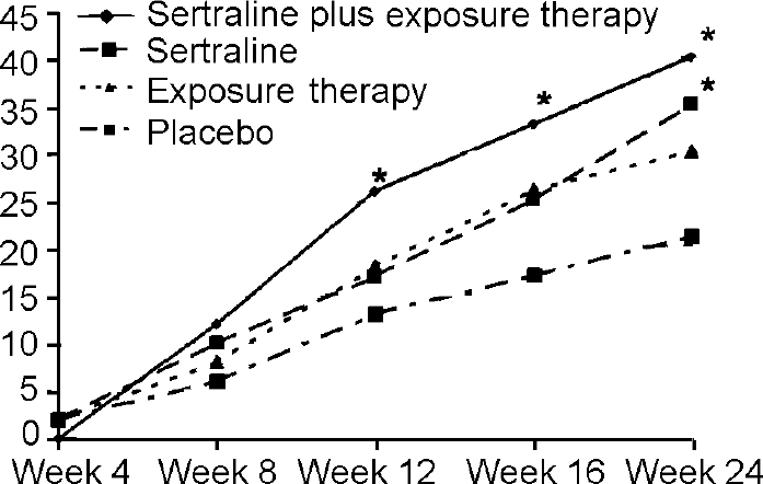Significantly more patients in the combined sertraline and exposure group fulfilled the response criteria compared with placebo from Week 12 and in all further assessments (see Fig. 2). Sertraline alone was significantly superior to placebo at the final visit in this analysis.