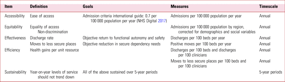 Some basic performance indicators (e.g. NHS Digital Reference NHS Digital2017) are show in Table 1. Further examples might include violent and self-harming incidents per 100 admissions per year or per 100 beds per year (this may be set as a ‘zero’ event); escape incidents from within the secure campus per 100 patients per year and absconding from leave outside the secure campus per 1000 episodes of day leave per year. Reoffending and readmission rates are often difficult to measure in individual services but should be collated nationally and internationally. Life expectancy and standardised mortality ratios should be regarded as key outcomes for forensic as well as general mental health services for those with severe mental illness (Uhrskov Sørensen Reference Uhrskov Sørensen, Bengtson and Lund2020).