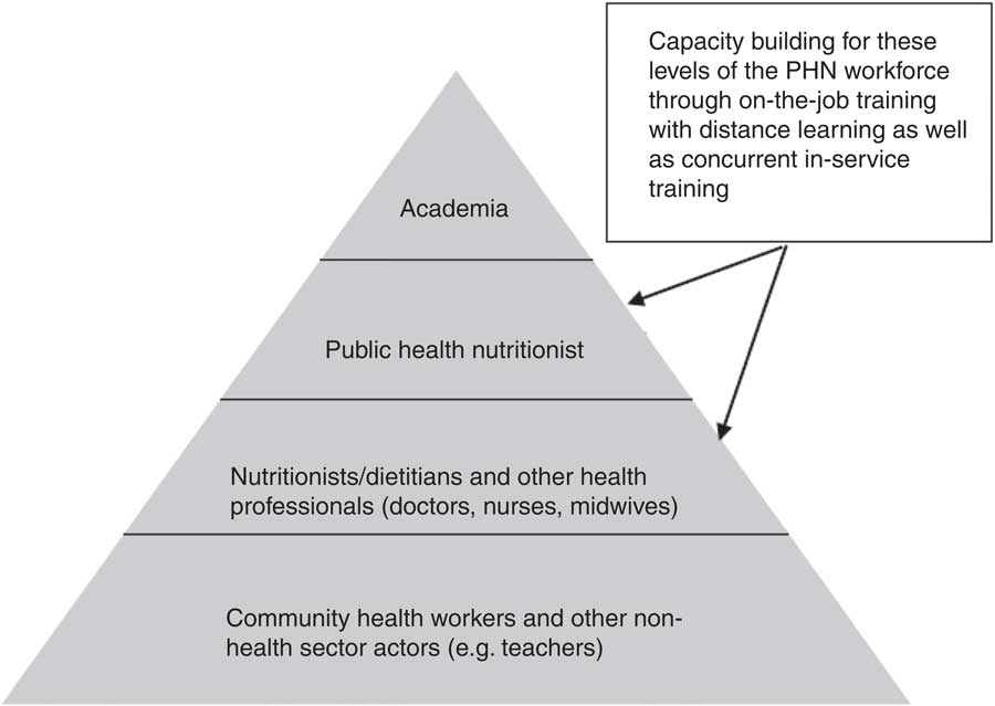 Nutrition capacity is often weak in LMIC especially, largely related to the absence of common understanding of the malnutrition problem( Reference Heaver 19 ). This lack of understanding as well as the relatively recent development of public health nutrition (PHN) science have undoubtedly contributed to the shortage of professionals capable of developing population-based approaches for the prevention of all forms of malnutrition as opposed to (or in addition to) a cadre capable of treating the consequences in individuals. A consensus is certainly growing that a robust and knowledgeable workforce is essential for PHN policy implementation( Reference Yngve, Tseng and Haapala 20 ). How to build that capacity is the question that still needs to be answered however, especially in LMIC.