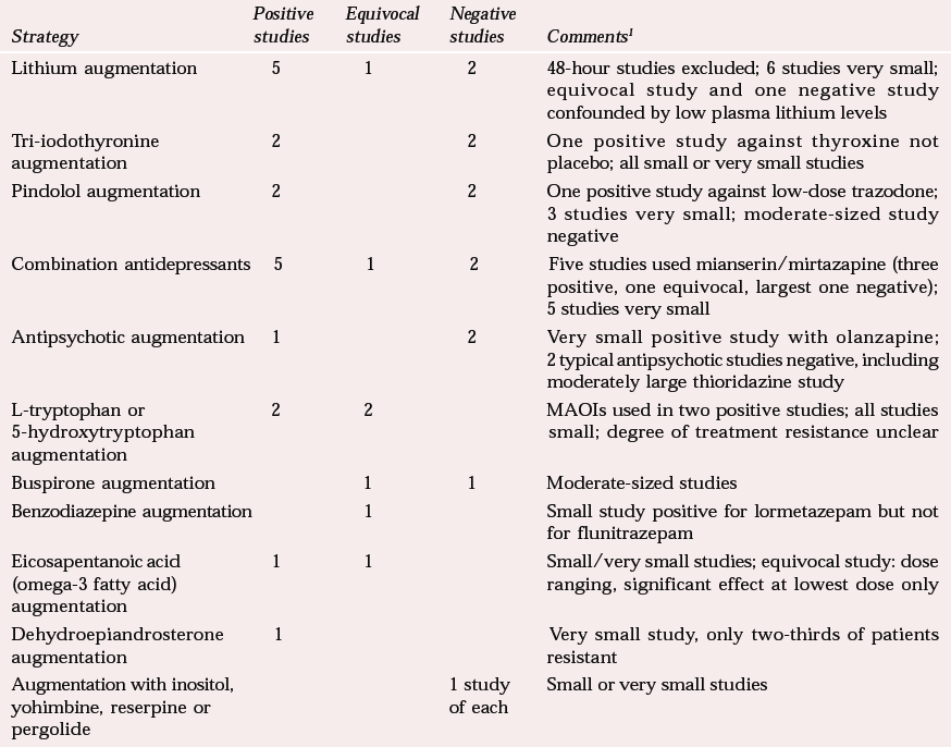 A number of meta-analyses and reviews of augmentation in treatment-resistant patients give positive results for lithium (Reference Austin, Souza and GoodwinAustin et al, 1991; Reference Bauer and DopfmerBauer & Dopfmer, 1999) and more equivocal results for tri-iodothyronine (Reference Aronson, Offman and JoffeAronson et al, 1996) and pindolol (Reference McAskill, Mir and TaylorMcAskill et al, 1998). Table 3 illustrates the diversity of strategies attempted, from which it is difficult to draw general conclusions.