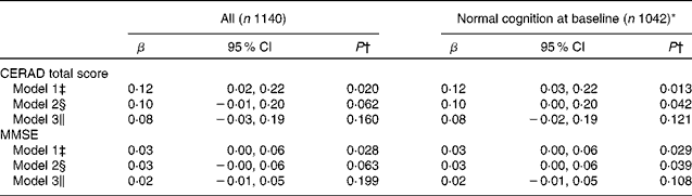 The Nordic diet score at baseline had been positively associated with the Verbal Fluency at 4 years in all individuals in Model 1 (β 0·10 (95 % CI 0·03, 0·18), P= 0·009) and in Model 2 (β 0·08 (95 % CI 0·00, 0·16), P= 0·039), but not in Model 3 (β 0·04 (95 % CI − 0·04, 0·13), P= 0·308). Similarly, a positive association had been found in individuals with normal cognition in Model 1 (β 0·10 (95 % CI 0·03, 0·18), P= 0·010) and in Model 2 (β 0·09 (95 % CI 0·01, 0·17), P= 0·033), but not in Model 3 (β 0·05 (95 % CI − 0·04, 0·14), P= 0·270). Furthermore, the Nordic diet score at baseline had been positively associated with the Word List Learning at 4 years in the entire group in Model 1 (β 0·07 (95 % CI 0·02, 0·12), P= 0·004) and in Model 2 (β 0·06 (95 % CI 0·01, 0·10), P= 0·022), but not in Model 3 (β 0·04 (95 % CI − 0·02, 0·09), P= 0·172). A similar positive association had been found in individuals with normal cognition in Model 1 (β 0·06 (95 % CI 0·02, 0·11), P= 0·009) and in Model 2 (β 0·05 (95 % CI 0·00, 0·10), P= 0·044), but not in Model 3 (β 0·03 (95 % CI − 0·02, 0·09), P= 0·205). Finally, there were no associations detected between the Nordic diet score at baseline and the other subtests of the CERAD-TS (i.e. Modified Boston Naming Test, Constructional Praxis, Word List Recall and Word List Recognition Discriminability) at 4 years (data not shown).