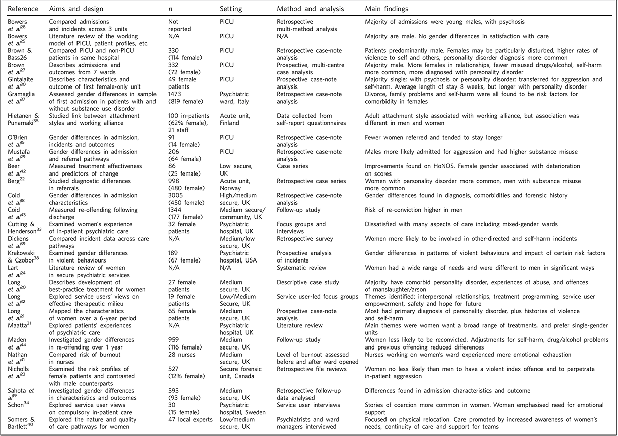 PubMed, Embase and PsycINFO were systematically searched using the following key terms: ‘PICU’, ‘psychiatric intensive care unit’, ‘secure’, ‘ward’, ‘gender’, ‘gender-sensitive’, ‘difference*’, ‘women’, ‘female*’, ‘psychiatric’, ‘serious mental illness’, ‘acute mental disorder’. Using these terms, a manual search of the Journal of Psychiatric Intensive Care was also conducted to identify further relevant articles. Researchers from a feminist perspective have suggested that using a variety of research methods leads to a more holistic portrayal of the subject in question. Reference Clifford-Walton and Romans17 In keeping with this perspective, the current review included the findings from both qualitative and quantitative studies. Specifically, studies that have focused on investigating gender differences in adult psychiatric in-patient services, in particular any studies that have investigated gender differences in PICU wards. This includes studies that have collected data from service users, staff and services in general. This was not limited to UK studies in order to obtain a more international picture of women's needs in these types of services. It is therefore acknowledged that, although PICU is a generally well-known term, in some countries the term emergency psychiatry may be used as a synonym for PICU.