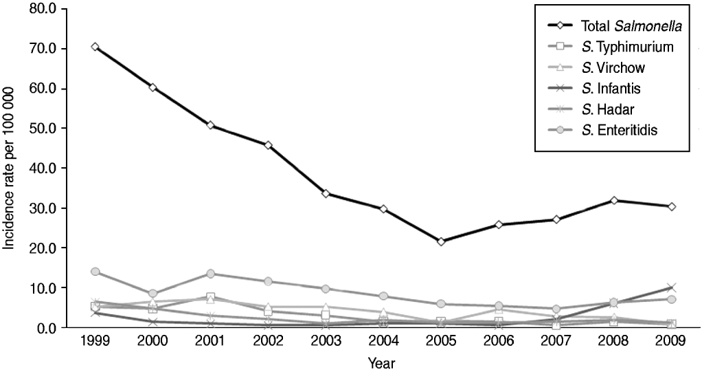 The FoodNet surveillance run by the CDC's Emerging Infections Program reported a decrease in the incidence rate of Salmonella laboratory-confirmed infections when comparing 1996–1998 and 2007 data [5]. A decrease was also demonstrated in Europe by Denny et al. [Reference Denny6] and in England and Wales [Reference Adak7].