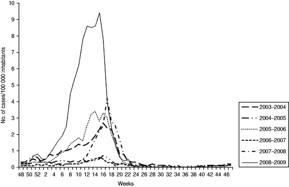 Reasons for the higher CFR in Chad remained unclear but the presence (56%) of N. meningitidis serogroup W135 [8] could be one of several factors. In Burkina Faso, the higher CFR is probably due to the presence of S. pneumoniae as the main aetiological agent, which is known to cause a much higher mortality [Reference Yaro10]. The biological results from these three neighbouring countries showed proportions of aetiological agents different from Niger, where the main agent identified in CSF was N. meningitidis serogroup A (97·5% of meningococcal meningitis). Very few N. meningitidis of serogroups X and W135 were found during the course of the epidemic and S. pneumoniae was identified in only 4% of positive CSF specimens. Finally, Nigeria and Niger were the most affected countries in West Africa during the 2009 season, together accounting for more than 85% of the cases [8, 9].