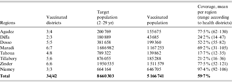 In response to the serogroup A meningococcal epidemic, surveillance was rapidly strengthened and case management using standard antibiotics (oily chloramphenicol, ceftriaxone or ampicillin when available) was facilitated by free treatment of meningitis cases and pre-positioning of care materials, antibiotics and antipyretics at regional, district and healthcare facility level. Based on the serogroup determination and epidemiological surveillance, reactive mass vaccination campaigns were launched by the Ministry of Public Health (MoPH) with the support of WHO and partners, including Médecins sans Frontières and UNICEF. These were targeted not only at districts that had reached the epidemic threshold, but also in those in alert status and adjacent to an epidemic district. The population of the capital (Niamey Region) unvaccinated since 2001 was also vaccinated although these districts had not reached the alert threshold. The target population for immunization was aged 2–29 years. The stockpile at the beginning of 2009 was 822 650 doses of bivalent (A+C) vaccine and complementary doses were provided by the International Coordinating Group (ICG) on Vaccine Provision for Epidemic Meningitis Control. Mass vaccinations allowed for progressive control of the outbreaks in most parts of the country. Finally 5 166 741 doses were administered to the whole country with vaccination coverage varying between 17% and 97% of the target population according to region (Table 1).