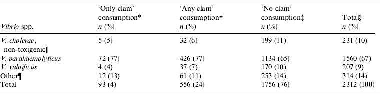 Table 1. Domestically acquired, seafood-associated vibrio infections, by species and by history of clam consumption, Cholera and Other Vibrio Illness Surveillance (COVIS), 1988–2010