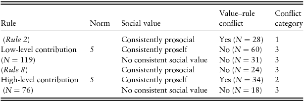 Note: The final column assigns individuals into one of three categories: (1) prosocial individuals with a value–rule conflict because they have a consistent value (column 3) that conflicts with the rule in column 1 (Rule 2); (2) proself individuals with a value–rule conflict because they have a consistent value (column 3) that conflicts with the rule in column 1 (Rule 8); and (3) participants without a value–rule conflict. Participants who cannot be classified as either prosocial or proself (N = 20) are not included.