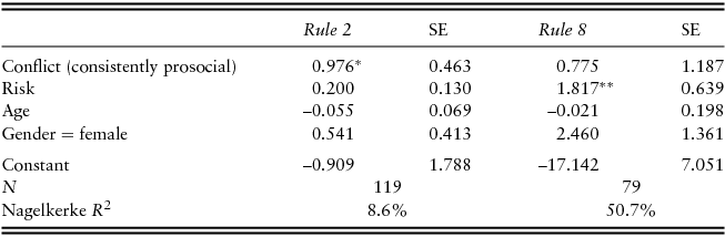 A similar analysis for the Rule 8 treatment shows no significant effect of a value–rule conflict on the attempts to change to Rule 2 (forth and fifth columns of Table 2), that is, consistent proselfs are not more likely to attempt change than all others. The regression also shows that attempting this rule change is positively correlated with one's willingness to take risks.