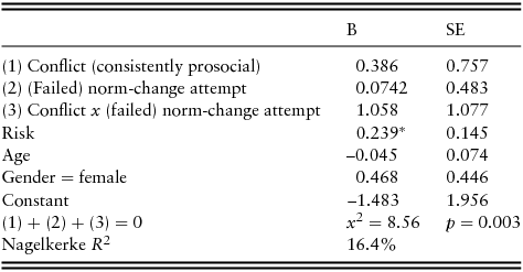 H2b predicts that individuals with a conflict try to change the contribution rule directly via voting, if they previously tried to change the norm and failed. To test this conjecture, we only consider teams where the norm did not change. This reduces the number of observations to 105. Table 3 provides the results of a logit regression of the call to vote (Rule 2 to Rule 8) on the same set of regressors as in Table 2, and includes two dummy variables and their interaction. The first reflects participants with a conflict (that is, the consistently prosocial) and the second captures individuals who have attempted a (failed) norm change. The interaction term between these two dummies allows us to isolate the group that H2b is concerned with. Including this interaction term means that the first dummy reflects individuals with a conflict who did not attempt a norm change, while the second concerns individuals without a conflict who attempted a (failed) norm change. For these two dummies, we do not expect an effect on inititating rule change. Indeed, the coefficients are not significantly different than zero. The hypothesis is concerned with individuals with a conflict who have attempted a norm change and failed. To test the effect on initiating rule change, we need to test whether the sum of the coefficents for individuals with conflict, for those who have attempted to change the norm and failed, and for whom the interaction term is different from zero. We find strong evidence that this is the case; the null of no effect is rejected (χ2 = 8.56; p = 0.003). This evidence that attempts to change the rule are preceded by attempts to change the norm provides strong support for H2b.
