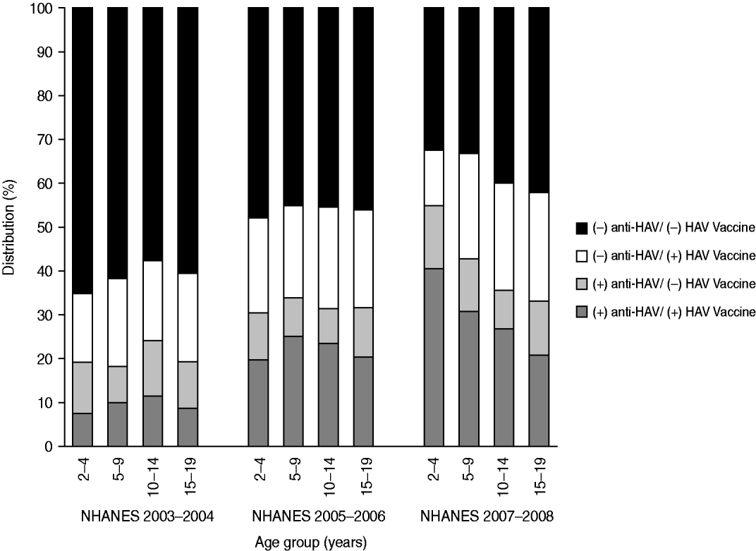 While developed countries have low hepatitis A endemicity, in the USA, young children and Mexican American or Hispanic children are at high risk of HAV infection [Reference Hayes-Bautista9–Reference Weinberg12]. More than 15 years have passed since the hepatitis A vaccine was introduced in the USA. The fervour to decrease HAV infection by targeting regions endemic for hepatitis A may have afforded herd immunity thus altering disease epidemiology. In 2007–2008, the NHANES included serological testing for anti-HAV that provided population-based seroprevalence data. We performed an analysis of the hepatitis A data made available in the NHANES 2007-2008 for subjects aged 2–19 years in order to assess the current determinants of anti-HAV seroprevalence in this age group as well as to assess epidemiological profile changes 15 years after hepatitis A vaccination was started.