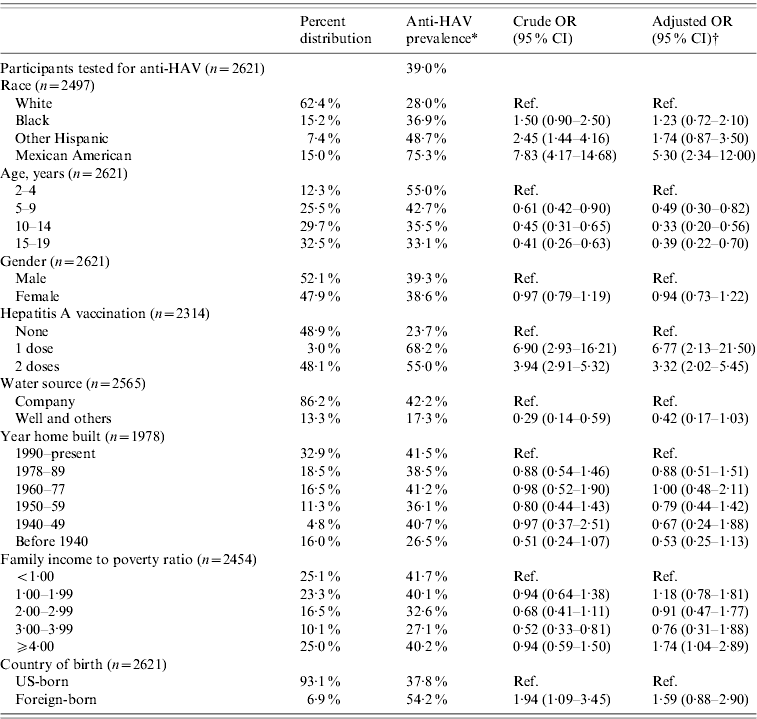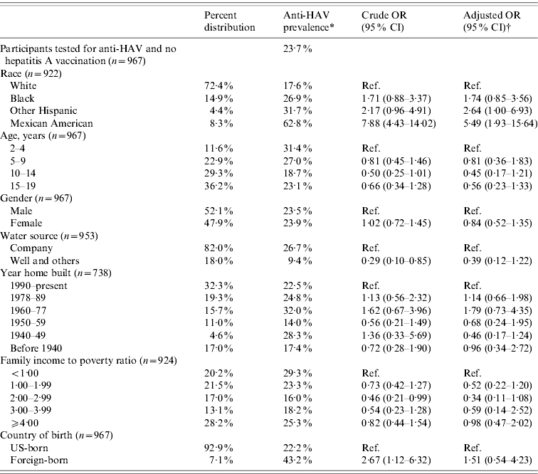 Table 2. Prevalence, crude and adjusted odds ratios for selected determinants of hepatitis A virus infection in non-vaccinated participants aged 2–19 years, NHANES 2007–2008
