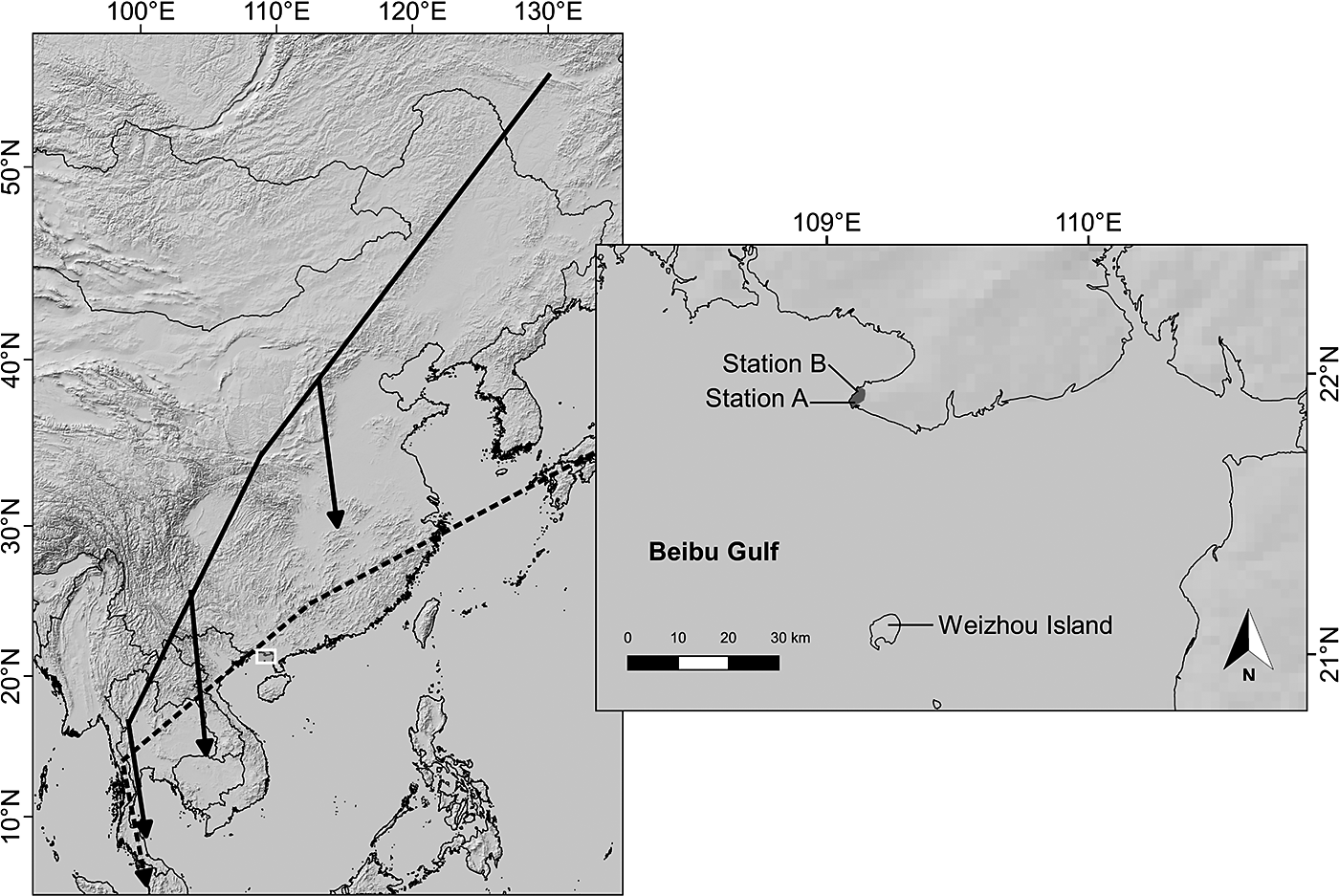 The migration survey was carried out in the Guantouling National Forest Park in Beihai, China (Figure 1). From 2015 to 2016, the counting station was located on the highest platform of the park (Station A: 21°27’10.9”N, 109°2’59.7”E). During military practices, the platform was closed, and counting was conducted at another station (Station B: 21°27’29.7”N, 109°3’9.7”E). From 2017, Station A was permanently closed, and all subsequent counting was conducted at Station B.