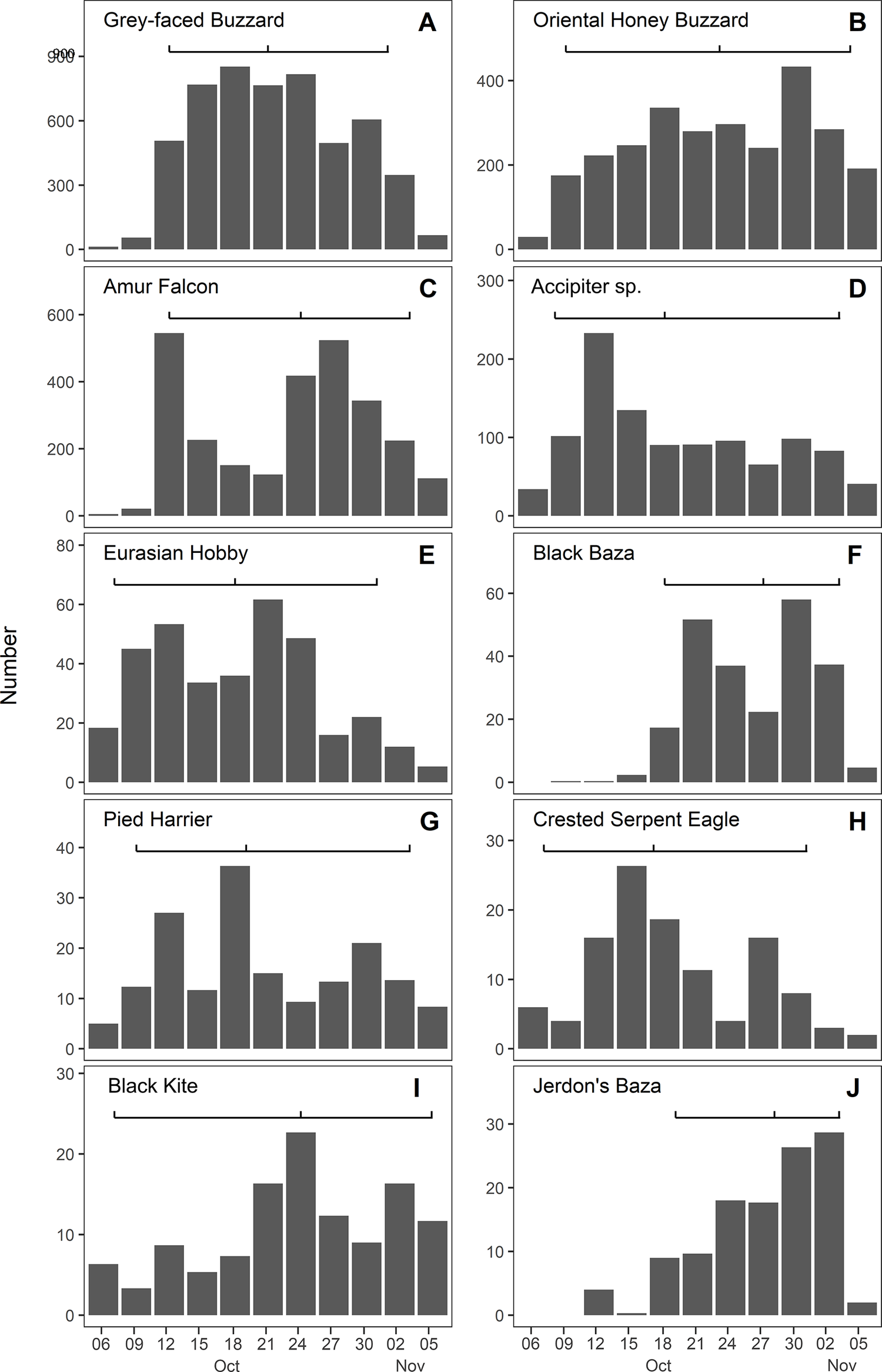 Main migration period for the 10 species varied from 16 to 28 days (Figure 2). The bulk of GB and AF migrated from mid-October till early November (Figure 2A and C), while OHB and Accipiter sp. migrated throughout the season (Figure 2B and D). Migration of Black Baza Aviceda leuphotes and Jerdon’s Baza Aviceda jerdoni concentrated in late October to early November (Figure 2F and J). Eurasian Hobby Falco subbuteo, Pied Harrier Circus melanoleucos and Crested Serpent Eagle Spilornis cheela were more numerous in the first half of the season, although not statistically significant for Pied Harrier (Figure 2E, G, H; Mann-Whitney test: P < 0.05, P = 0.6, P < 0.05 respectively) while Black Kite Milvus migrans were the opposite (Figure 2I, P = 0.07).