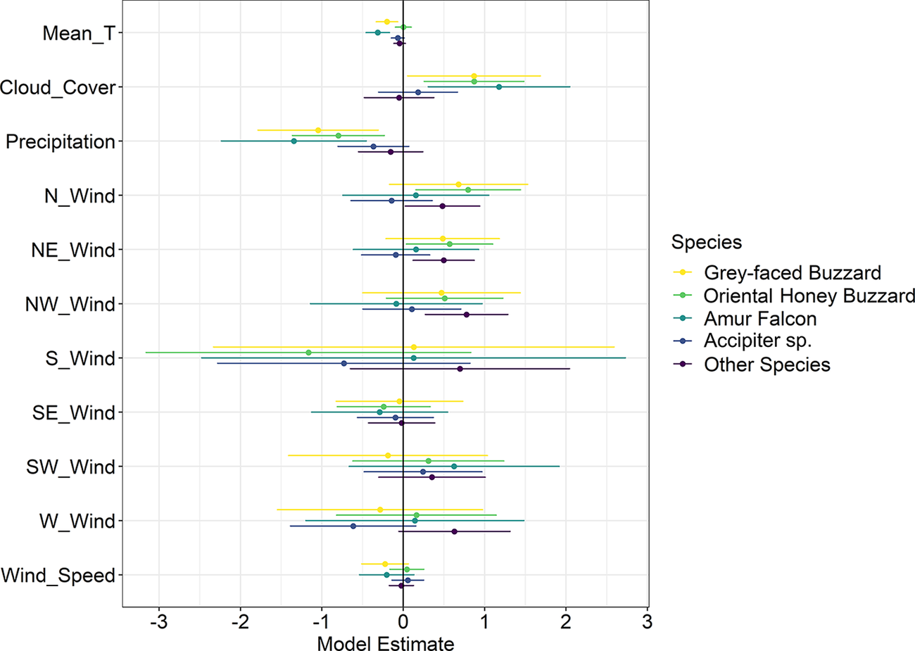 Figure 3. Weather influence on the daily counts of raptor species. Dots represent the model estimates of predictors and line segments represent the 95% confidence interval. The model estimates for the increasing and decreasing trend are not shown.