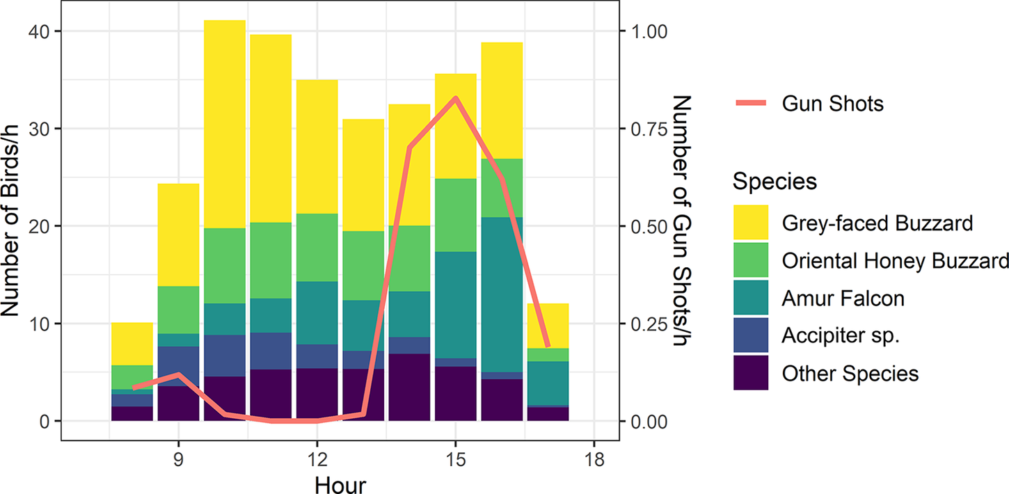 To explore the hourly patterns of raptor migration and gunshot intensity, we divided the day into 10 hourly intervals (08h00–9h00 to 17h00–18h00) and allocated each observation to its respective hourly interval. Hourly migration traffic rate was calculated by dividing the sum of number of individual birds by the total number of each hourly interval counted during the five years. Hunting intensity was represented by the number of gunshots in each hourly interval, calculated in the same manner as the migration traffic rate.