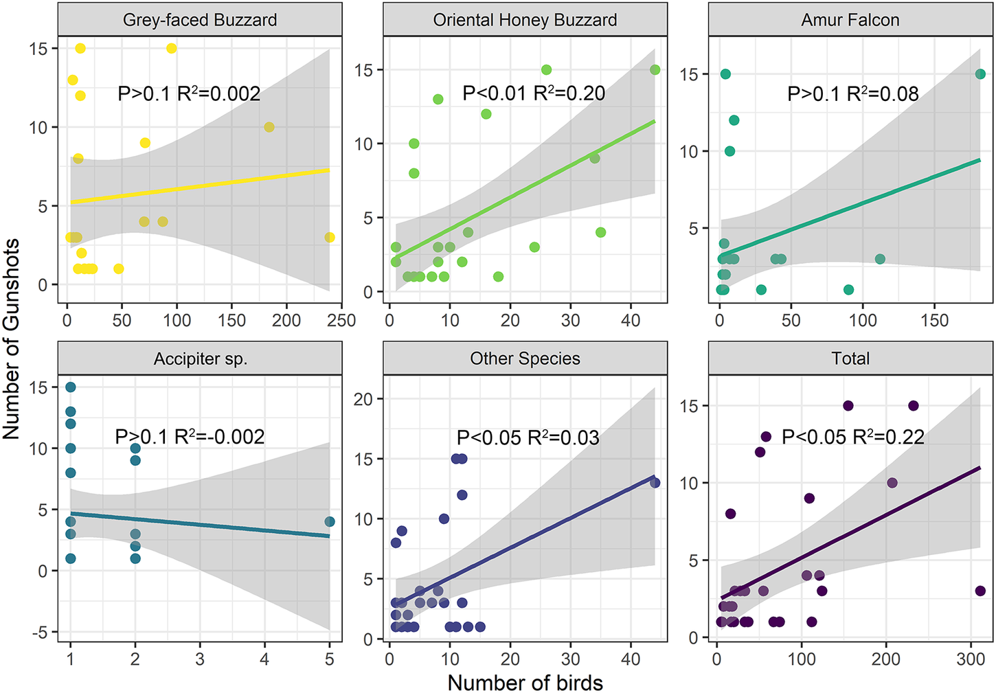 Given the intense relationship between counters and hunters, direct methods (i.e. questionnaires) to identify the major target species were not applicable. Instead, we adopted a Poisson GLMM model to study the relationship between number of gunshots heard and the number of raptors in one hour. Only the hours with both gunshots and migrating raptors recorded are used in the model. We used the same set of random effects as the previous model. All statistical analysis was carried out in R (R Core Team 2019).