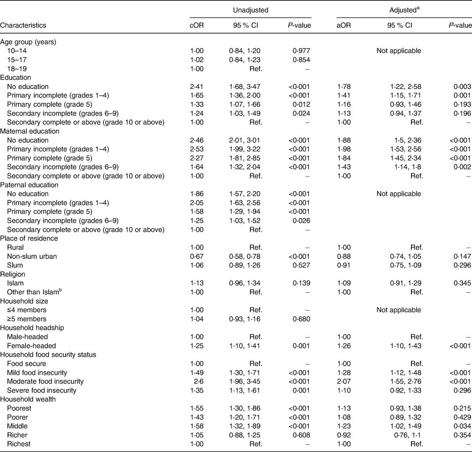 Binary logistic regression was done to assess the relationship of inadequate DD with each of the explanatory variables separately. The explanatory variables with P-value ≤0⋅2 in the univariate model were included in the final multivariable logistic regression model(Reference Bursac, Gauss and Williams39,Reference Kibria40) . Multi-collinearity was checked using the ‘correlation matrix’ to identify the independent variables with higher correlation, and the variables with correlation coefficient ≥0⋅5 were excluded (age and paternal education: as these variables were highly correlated with educational attainment of adolescents and maternal education, respectively) before running the multivariable logistic regression. After considering P-value during univariate analyses and multi-collinearity, education, maternal education, place of residence, religion (only for boys), household headship, household food insecurity status and household wealth were included in the multivariable logistic regression model. The crude odds ratio (cOR), adjusted odds ratio (aOR) and 95 % CI of OR were estimated, and a P-value of <0⋅05 was considered as statistically significant. All statistical analyses were performed using the statistical software package Stata (version 13.0).