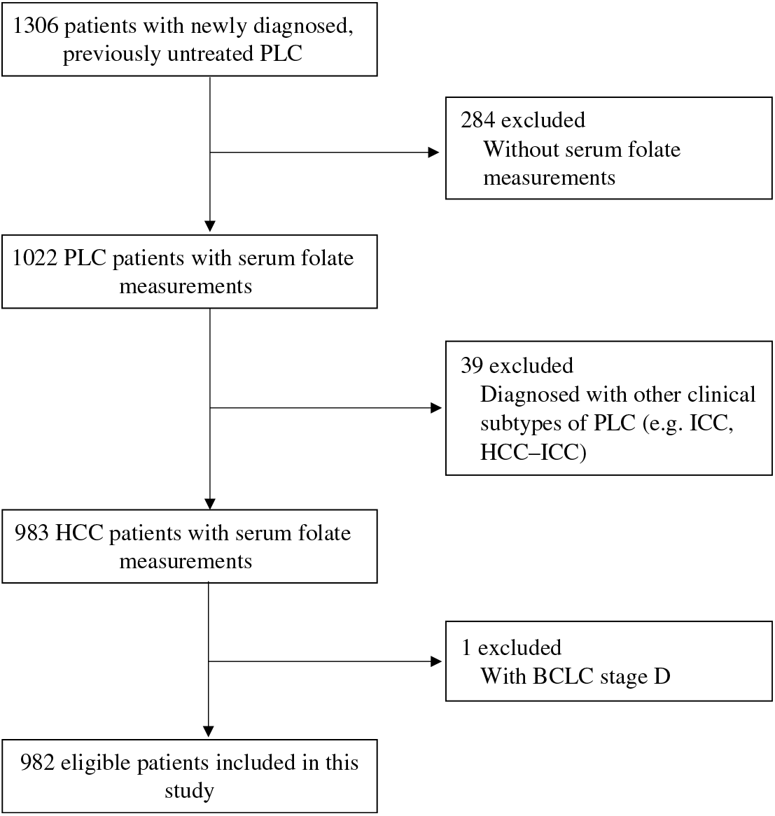 Between September 2013 and February 2017, we enrolled 1306 eligible patients into the GLCC. After excluding 324 patients who had no available serum samples for folate measurements, were diagnosed with PLC other than HCC (e.g. intrahepatic cholangiocarcinoma (ICC) and HCC-ICC) or had the Barcelona Clinic Liver Cancer (BCLC) stage D, we finally included 982 patients with newly diagnosed, previously untreated HCC in the present study. Detailed participant selection is shown in Fig. 1. The included patients did not differ by demographics and lifestyle characteristics from the patients excluded from the analysis (Supplementary Table S1). Among the included patients, 59·6 % of the patients were pathologically confirmed.