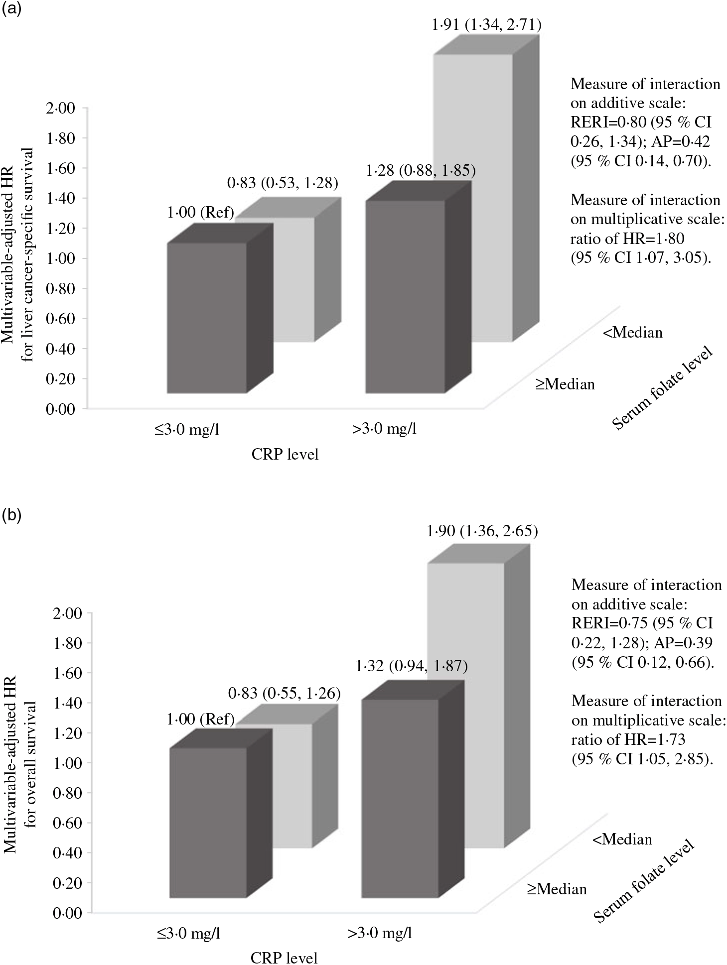 Fig. 2. Joint effects of serum folate and C-reactive protein (CRP) levels on survival outcomes in the Guangdong Liver Cancer Cohort study. (a) Liver cancer-specific survival and (b) overall survival. HR, hazard ratio; Ref, reference; RERI, relative excess risk due to interaction; AP, attributable proportion due to interaction. Measures for additive interaction and corresponding 95 % CI are estimated using the delta method. HR are estimated from Cox proportional hazards models adjusting for age at diagnosis (continuous), sex (women, men), BMI (continuous), smoking status (never, former, current), alcohol drinking status (never, former, current), baseline liver damage score (0, 1–2, ≥3), Barcelona Clinic Liver Cancer stage (0, A, B, C) and cancer treatment (hepatectomy/liver transplantation, local ablation, hepatic arterial intervention, other treatments).