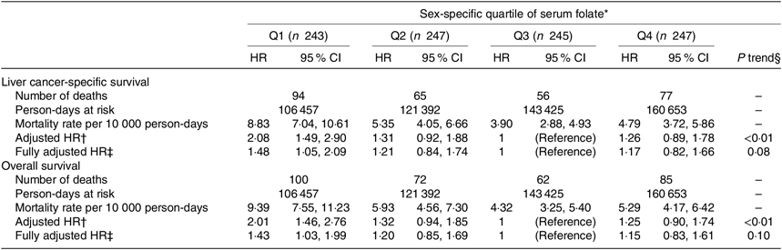 Table 2. Multivariable-adjusted associations between sex-specific quartiles (Q) of serum folate concentrations and survival outcomes in the Guangdong Liver Cancer Cohort study