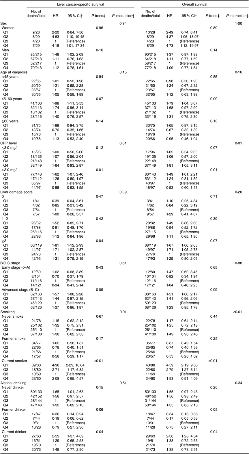 † Adjusted for age at diagnosis (continuous), sex (women, men), BMI (continuous), smoking status (never, former, current), alcohol drinking status (never, former, current), CRP level (≤3·0 mg/l, >3·0 mg/l), baseline liver damage score (0, 1–2, ≥3), BCLC stage (0, A, B, C) and cancer treatment (hepatectomy/liver transplantation, local ablation, hepatic arterial intervention, other treatments), and the corresponding variable was removed from the multivariable models when it was a stratified factor.