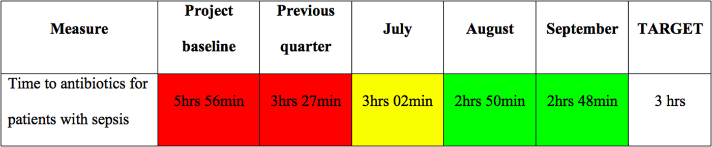 Once your project has reached a steady state, you will want to build safeguards to ensure its sustainability. There are many different methods available to sustain change in health care.Reference Ogrinc and Headrick 31 One useful method consists of using visual management tools. One practical way to use this for your sepsis project would be to create a performance board, as shown in Figure 2, that displays an outcome of interest (e.g., time to antibiotics) over relevant time periods. Colours are often used to demonstrate the successes and shortcomings of the project conspicuously.