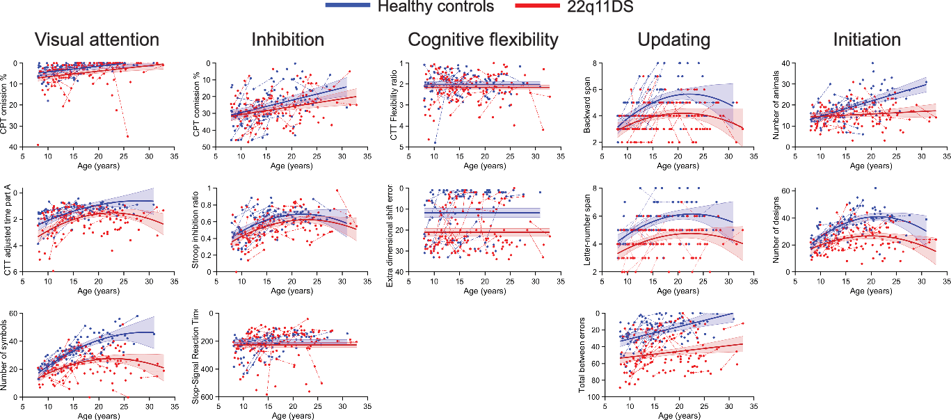 Fig. 2. Developmental trajectories of executive functions and attention domains. The solid lines show the developmental model best fitting the data. Data points from a single subject are connected by a dotted line. Scores from the 22q11DS group are displayed in red and healthy controls in blue. Note that in all sub-figure, scores depicted toward the top of the figure represent better performance whereas score depicted toward the bottom represent worse performance. To improve clarity of interpretation, scales of the y axis have therefore been reversed when lower scores indicated better performance (e.g., less errors), with low scores at the top of the figure and high scores at the bottom.