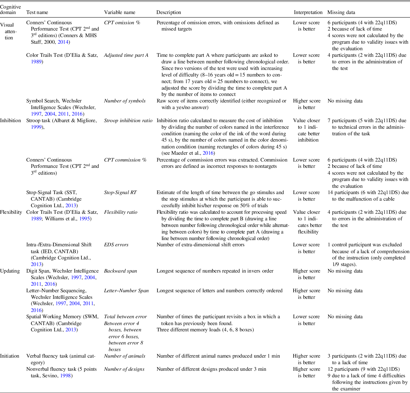 Table 2. Details of the measures of executive functions and attention and information about missing data