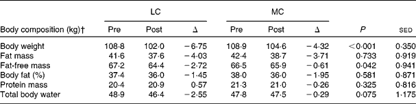 Table 2 Average measured change in body weight (kg) and composition (kg) on the study diets, where the low carbohydrate (LC) diet is a high-protein, low-carbohydrate diet and the moderate carbohydrate (MC) diet is a high-protein, medium-carbohydrate diet, for the 4-week intervention period*
