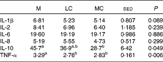 Table 5 Effect of the maintenance (M), low-carbohydrate (LC) and medium-carbohydrate (MC) diets on plasma inflammatory markers (pg/ml) in twelve volunteers