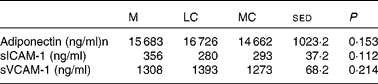 Mean values for the CVD risk markers adiponectin, soluble intercellular adhesion molecule-1 and soluble vascular cell adhesion molecule-1 in the plasma are presented in Table 6. There was no significant effect of WL or diet composition on any of these markers.
