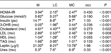 Table 7 Effect of the maintenance (M), low-carbohydrate (LC) and medium-carbohydrate (MC) diets on the homeostasis model assessment of insulin resistance (HOMA-IR) and plasma lipaemia* in sixteen volunteers
