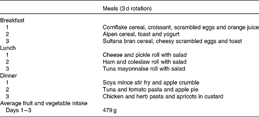 The composition of each meal, in terms of energy, fat, carbohydrate and protein, was calculated using McCance and Widdowson's The Composition of Foods (5th edition) and supplements(Reference Holland, Welch and Unwin10). All meals on the LC diet comprised 30 % protein, 4 % carbohydrate and 66 % fat by energy; while the MC meals contained 30 % protein, 35 % carbohydrate and 35 % fat. All meals within both diets had a fixed energy density of 5·75 MJ/kg. Lunch and dinner meals were fixed intake, with the LC meals containing 47·1 g (800 kJ) protein, 47·7 g (1765 kJ) fat, 6·63 g (106 kJ) carbohydrate and 2667 kJ energy. The MC lunch and dinner meals contained 47·2 g (802 kJ) protein, 25·3 g (936 kJ) fat, 58·5 g (936 kJ) carbohydrate and 2667 kJ energy. Subjects had a choice of seven breakfast meals, cooked on request, which varied from, per meal, 2·46 to 3·00 MJ and 2·31 to 2·92 MJ for the LC and the MC diets, respectively, with fixed macronutrient composition (%). See Appendices 1 and 2 for menus.