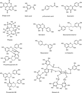 Nuts are rich in phenolic phytochemicals and are identified among the richest sources of dietary polyphenols(Reference Pérez-Jiménez, Neveu and Vos35). A recent comprehensive review on tree nut phytochemicals has been published by Bolling et al. (Reference Bolling, Oliver Chen and McKay11). Therefore, a detailed compositional comparison was not intended for this review. It should be noted that quantitative values for phytochemicals in nuts vary widely in some instances. Proanthocyanidins and hydrolysable tannins are generally the most abundantly found polyphenols in some nuts (Table 1). Nuts also have a significant phytate content as well as flavonoid, phenolic acid and stilbene polyphenol classes. Fig. 1 shows the chemical structures of some phytochemicals present in nuts.