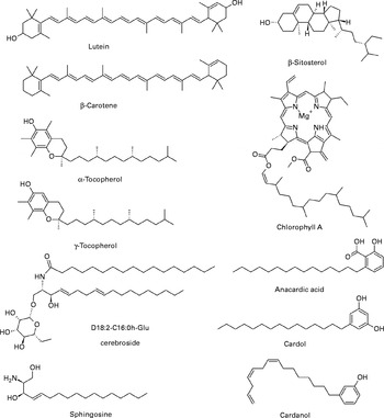 There has been an increasing interest in discussing the functional characteristics of nut oils as they seem to be an interesting source of bioactive constituents. Fig. 2 shows chemical structures of some fat-soluble bioactives present in nuts. Table 2 summarises the fat-soluble bioactives in nuts (lipid, tocols, phytosterols, sphingolipids, carotenoids, chlorophylls and alkyl phenols).