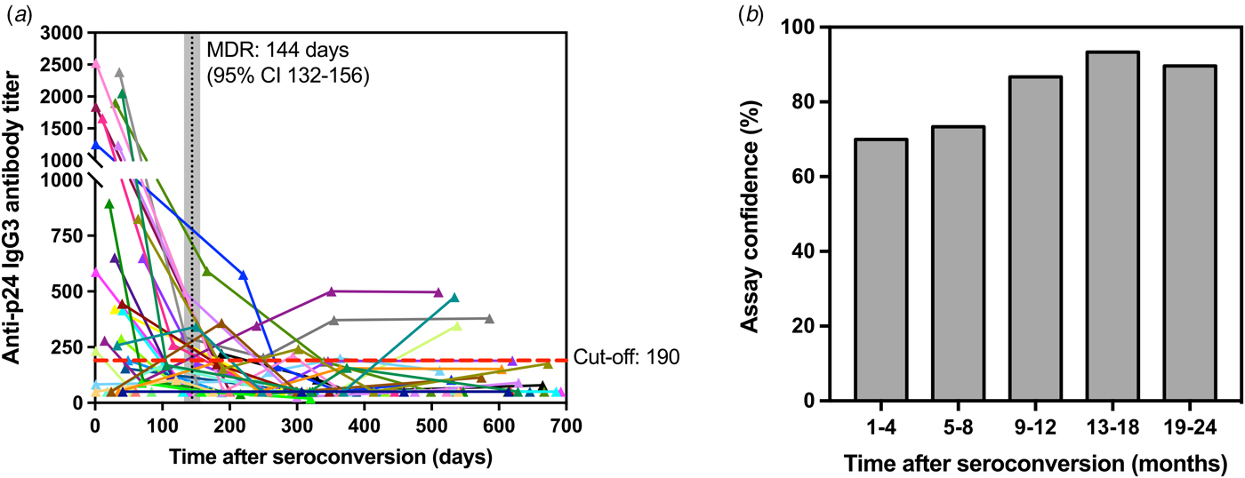 Fig. 4. Kinetics of p24-specific IgG3 antibodies as measured by our ELISA assay in 150 sequential serum samples from 30 HIV-1 positive and recently seroconverted individuals in relation to time since seroconversion (days). (a) – Each line represents a single individual with sequential specimens collected over time post-seroconversion (in days). Cut-off (titre = 190) is shown as a red dashed line, whereas the mean duration of recent infection (144 days) and corresponding confidence interval (95% CI 132-156) are shown as a vertical black line and shaded grey area, respectively. (b) – Confidence levels of the developed assay are shown as the frequency of individuals correctly classified as recent (1–4 months) and non-recent (5–24 months) according to the assay cut-off described in (a).