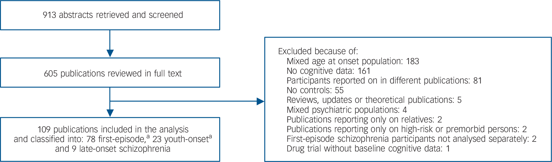 The 913 retrieved publications and their relevant cited and citing references were reviewed by one of the authors (T.K.R.). A total of 78 first-episode schizophrenia, 23 youth-onset schizophrenia and 9 late-onset schizophrenia publications were included in the analysis (Fig. 1; see also the Online supplement for a full list of publications included in the analysis). Age at onset was operationally defined in all of the late-onset schizophrenia and 12 of the youth-onset schizophrenia publications. The remaining 11 youth-onset schizophrenia publications did not define age at onset operationally. However, in all these publications, individuals met DSM–III or later diagnostic manual criteria for schizophrenia before the age of 19. In first-episode schizophrenia publications, the first episode was always operationally defined: 61 did not define age at onset operationally.