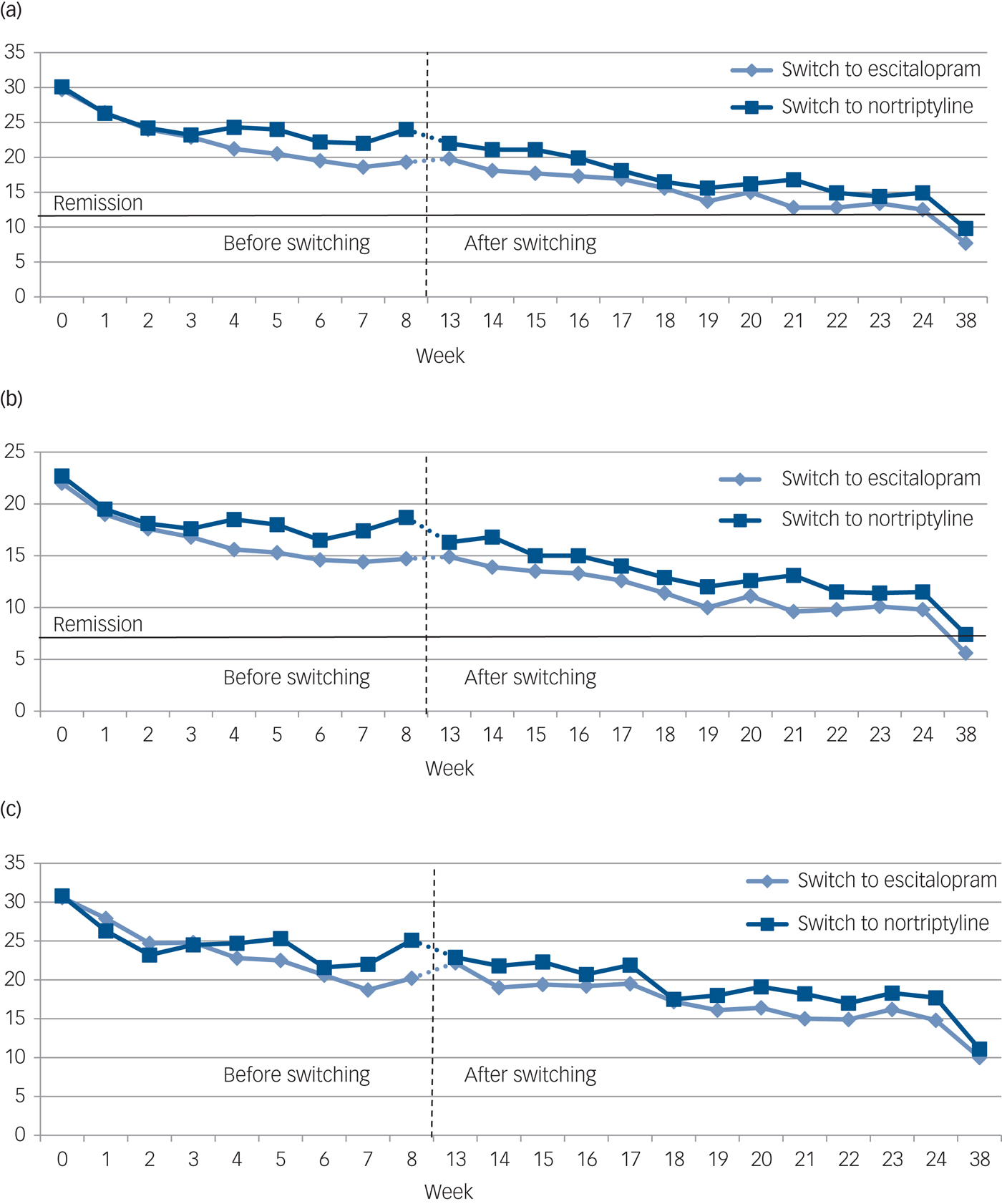 Fig. 1 The development of mean scores on three standard rating scales (a–c) among patients with major depressive disorder (MDD) before (week 0–8) and after (week 13–38) switching from nortriptyline to escitalopram (n = 72) or from escitalopram to nortriptyline (n = 36).