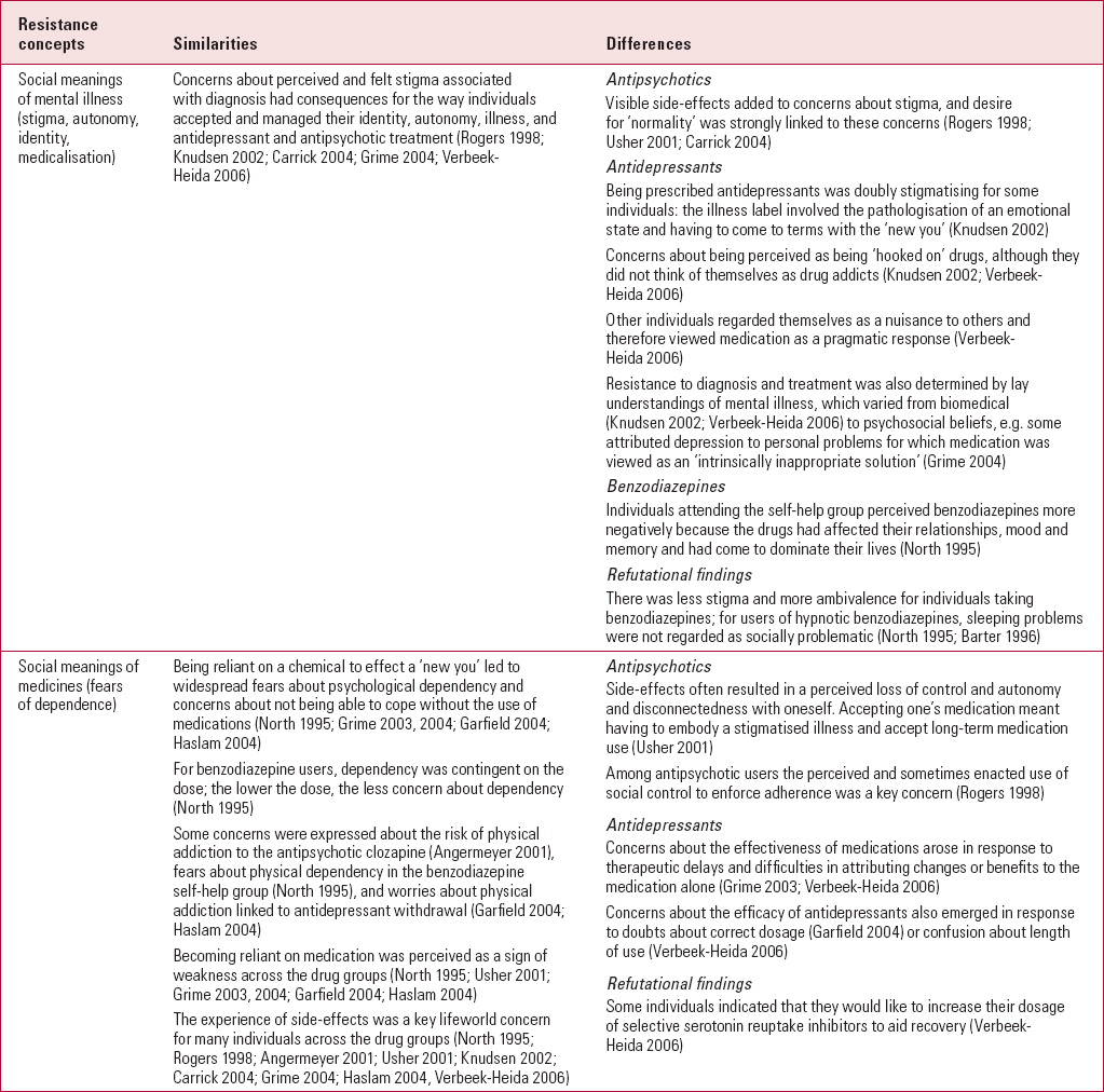| Social meanings of mental illness (stigma, autonomy, identity, medicalisation) | Concerns about perceived and felt stigma associated with diagnosis had consequences for the way individuals accepted and managed their identity, autonomy, illness, and antidepressant and antipsychotic treatment (Reference Rogers, Day and WilliamsRogers 1998; Reference Knudsen, Hansen and TraulsenKnudsen 2002; Reference Carrick, Mitchell and PowellCarrick 2004; Reference Grime and PollockGrime 2004; Reference Verbeek-Heida and MathotVerbeek-Heida 2006) |