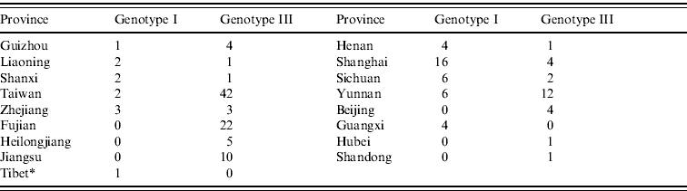 Table 1. Numbers of isolates in genotypes I and III in each endemic province