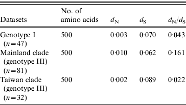 The selection pressure acting on the envelope gene of JEV as measured by average d N/d S values are shown in Table 2. There were no significantly synonymous variations in the three datasets. However, the non-synonymous variation of mainland clade was much higher, characterized by the highest d N/d S value, being 7·3 times higher than Taiwan clade and 3·7 times higher than ‘genotype I’. These data suggest that mainland clade was under weaker purifying selection compared to genotype I and the Taiwan clade.